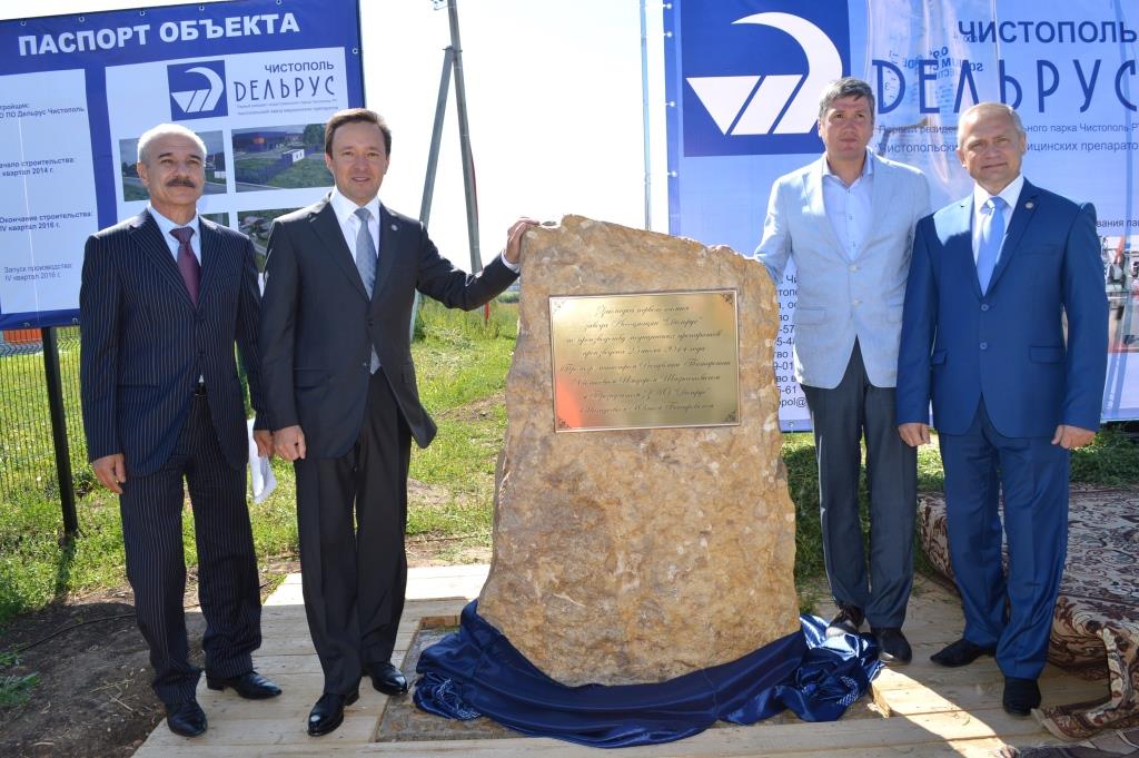 Президент Республики Татарстан Рустам Минниханов, Глава Чистопольского муниципального района Ильдус Ахметзянов, а также Президент компании "Дельрус" Юлай Магадеев и представитель компании "СКД Инвест" Ринат Саматов заложили капсулы в первые камни строительства первых двух предприятий индустриального парка "Чистополь".