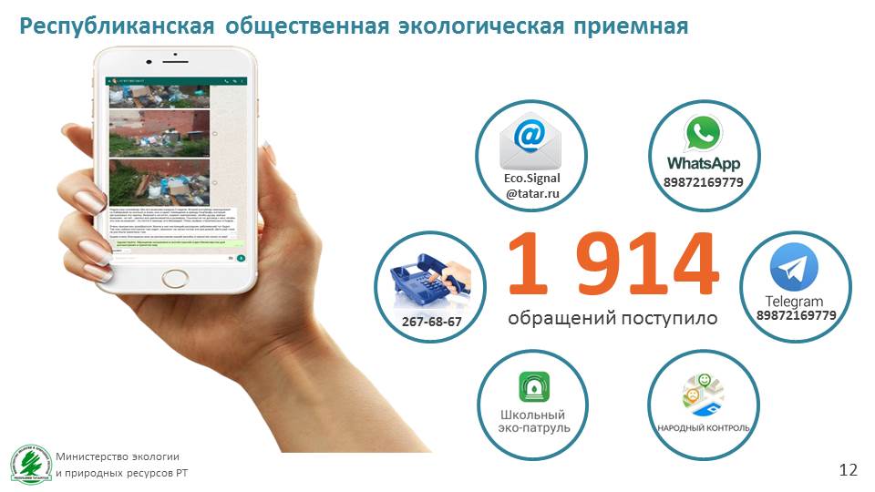Хочется отметить, что деятельность министерства, проводимая в области обращения с отходами, включает в себя не только надзорные мероприятия. Для комплексного решения поддерживается общественная пропаганда для населения по поддержке чистоты у себя в доме, на улице, в городе и республике. В целях вовлечения населения создана республиканская общественная экологическая приемная, включающая различные каналы обмена информацией. Это и горячая линия, интернет приемная, информационные системы «Народный контроль», «Школьный экопатруль», дополнительные каналы связи WhatsApp и Telegram. Также для решения экологических задач Министерством осуществляются денежные выплаты гражданам, предоставившим оперативную информацию о нарушениях природоохранного законодательства на территории республики. Сумма выплат составляет 1 500 рублей.