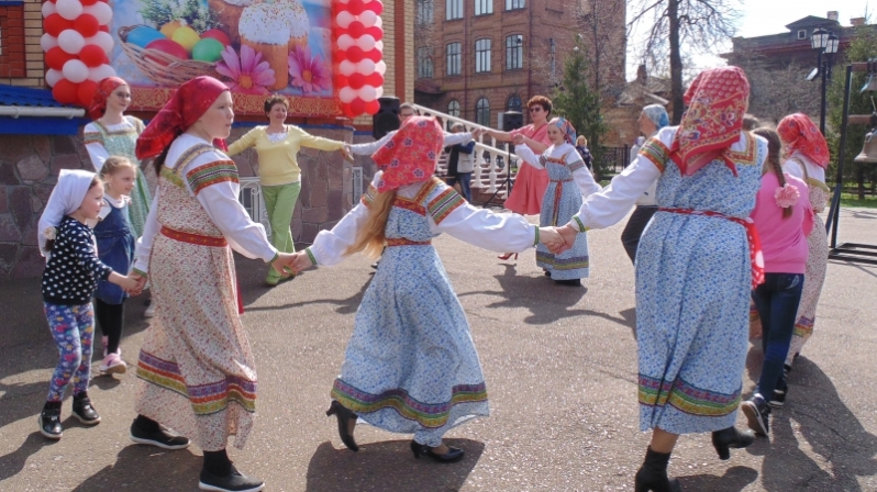 Приглашенный гость из Казани Сергей Кистень подготовил яркую и веселую программу «Вечерка на Красную горку». Под затейливые звуки балалайки и взрослые, и дети закружились в хороводах, народных играх.