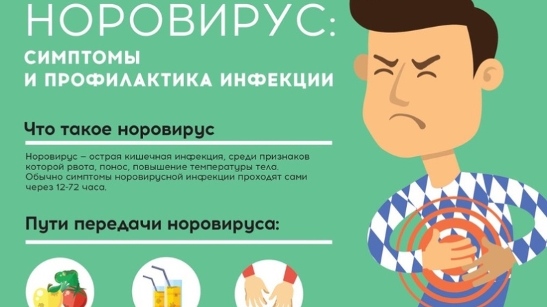 Норовирусная инфекция проявляется ярко выраженной кишечной симптоматикой в виде острой диареи (водянистый стул без каловых масс и без запаха, иногда с примесью прозрачной слизи 1-10 раз в сутки), рвоты, лихорадки и характеризуется быстрым течением. Основными путями проникновения вируса в организм являются: пищевой — при употреблении немытых овощей или фруктов; водный — при употреблении жидкостей, содержащих вирус; контактно-бытовой, когда в организм вирус проникает через посуду, предметы обихода, немытые руки.