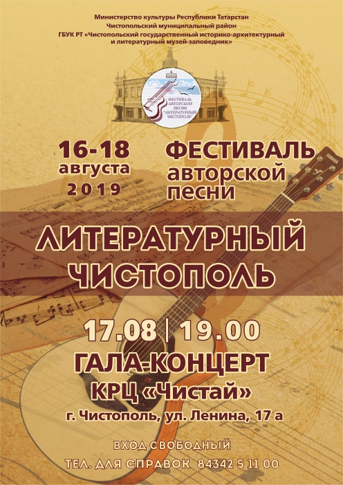 16-18 августа 2019 года состоится 4-й межрегиональный Фестиваль авторской песни «Литературный Чистополь». Организаторами фестиваля выступают Министерство культуры Республики Татарстан, Чистопольский государственный историко-архитектурный и литературный музей-заповедник, Чистопольский муниципальный район.