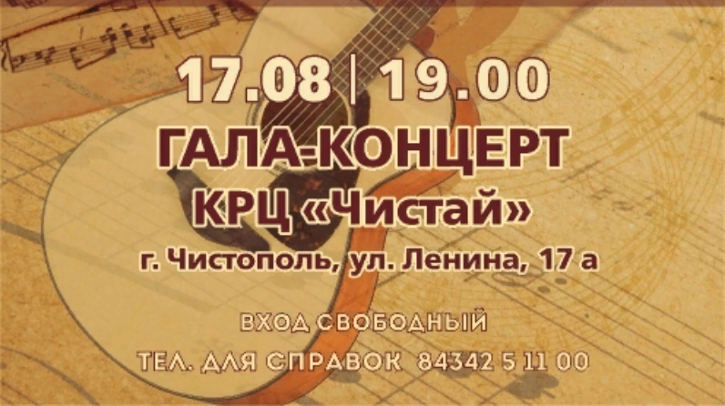 Заключительным аккордом и главным событием фестиваля станет церемония награждения победителей и Гала-концерт с участием членов жюри и почетных гостей, который пройдет 17 августа 2019 года в Культурном центре «Чистай» по адресу г. Чистополь, ул. Ленина, 17а.