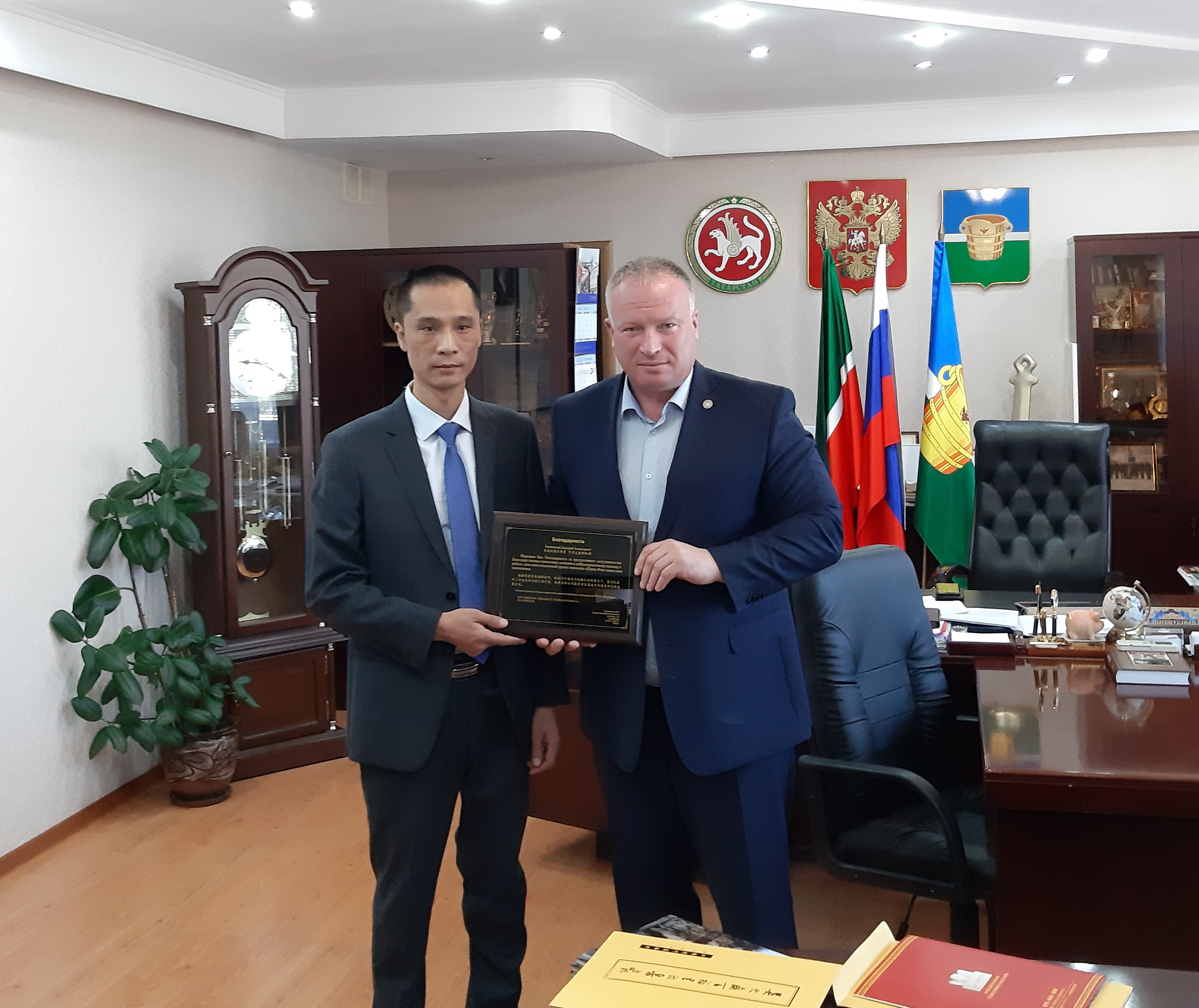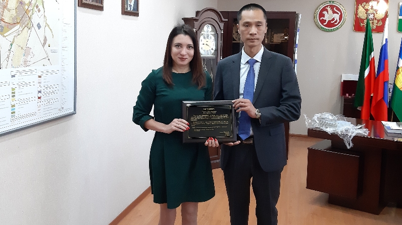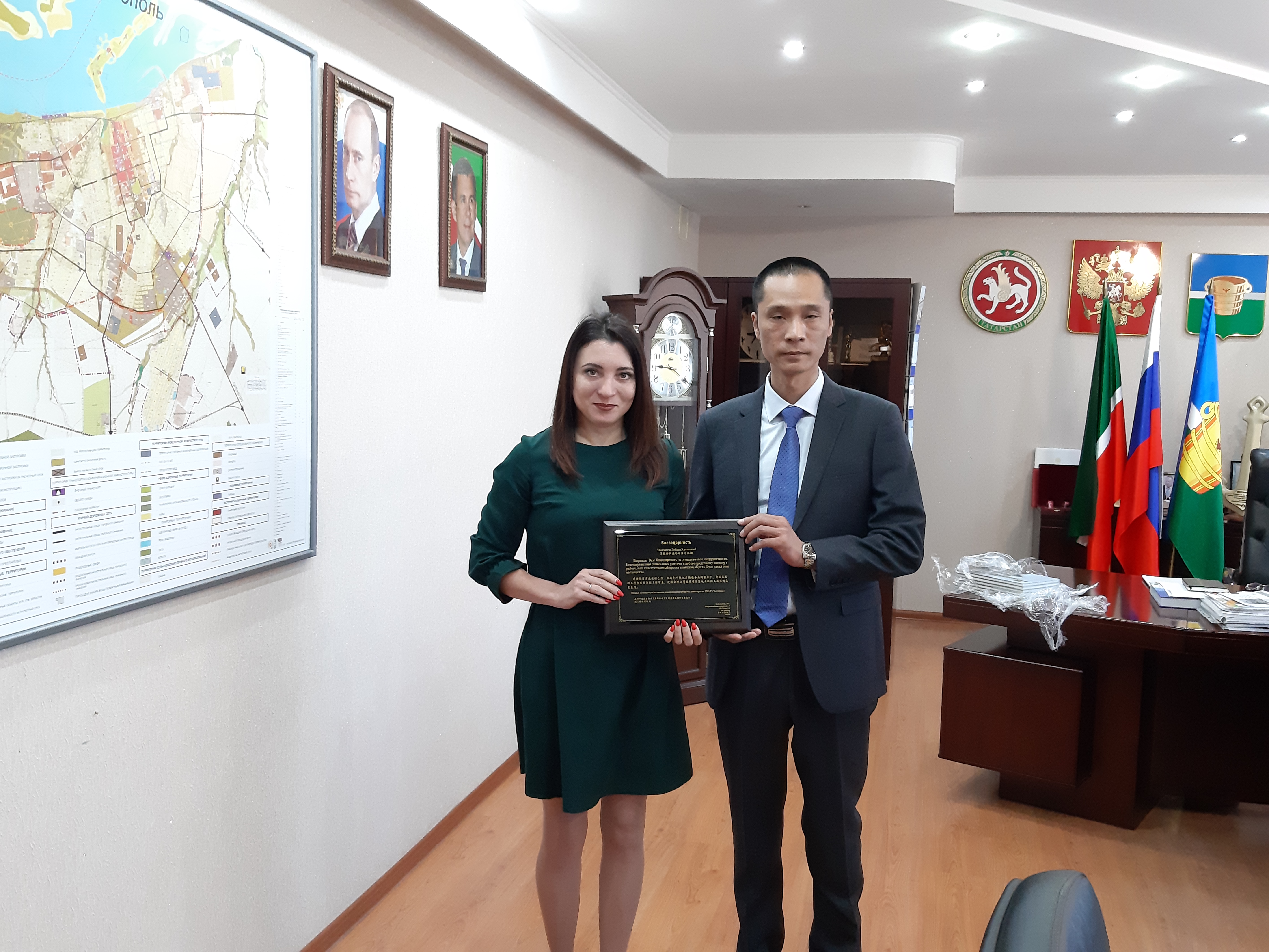В рамках визита Минфэн Цзоу вручил Дмитрию Иванову и Лейсан Кашаповой благодарственные письма за помощь в процессе получения ООО «Цзинь Фэн» статуса резидента ТОСЭР «Чистополь».