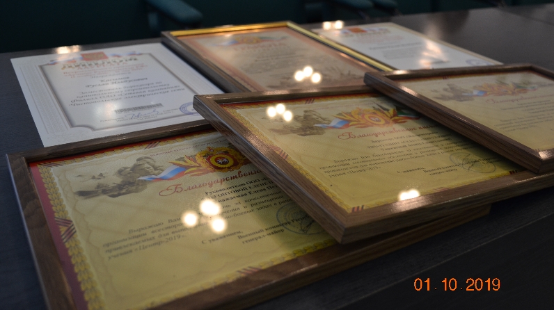 Грамотой Военного комиссариата Республики Татарстан за качественное и своевременное выполнение задач по организации всестороннего обеспечения и размещения подразделений территориальных войск, привлекаемых для выполнения учебно-боевых задач в рамках стратегического командно-штабного учения «Центр-2019» награжден директор школы РОСТО ДОСААФ Асхат Давлетшин. Благодарственным письмом военного комиссара Республики Татарстан председатель правления Чистопольского районного потребительского общества Марат Губеев, директор ООО «Жилремсервис» Асхат Гизатуллин и руководитель ООО «Благо-В» Елена Флегонтова.