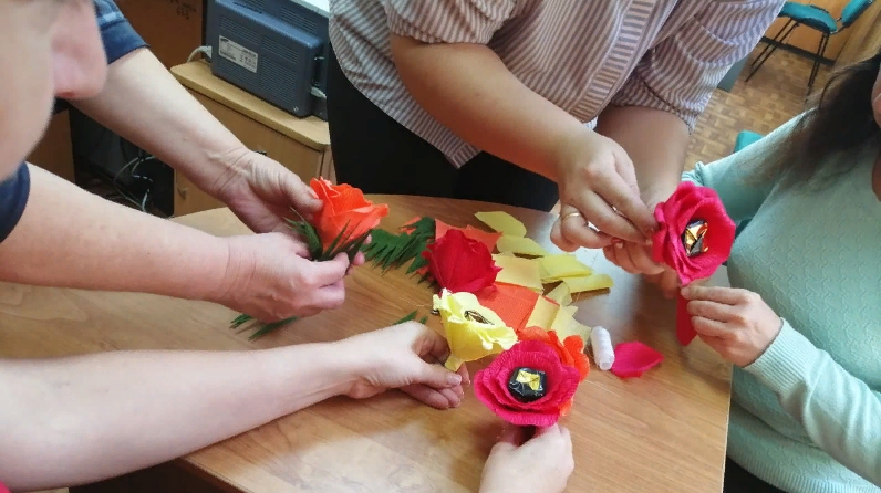 4 октября 2019 года в рамках декады пожилого человека на базе ОСПСиД ГАУСО «КЦСОН «Балкыш» МТЗ и СЗ РТ в Чистопольском муниципальном районе» прошел мастер-класс по изготовлению букета из чая и конфет для женщин, состоящих на обслуживании. Женщины ознакомились с основами изготовления букета из конфет и гофрированной бумаги. Участницам мастер-класса понравилась такая идея. Некоторые женщины изъявили желание сделать такой букет самостоятельно и подарить своим пожилым родителям.