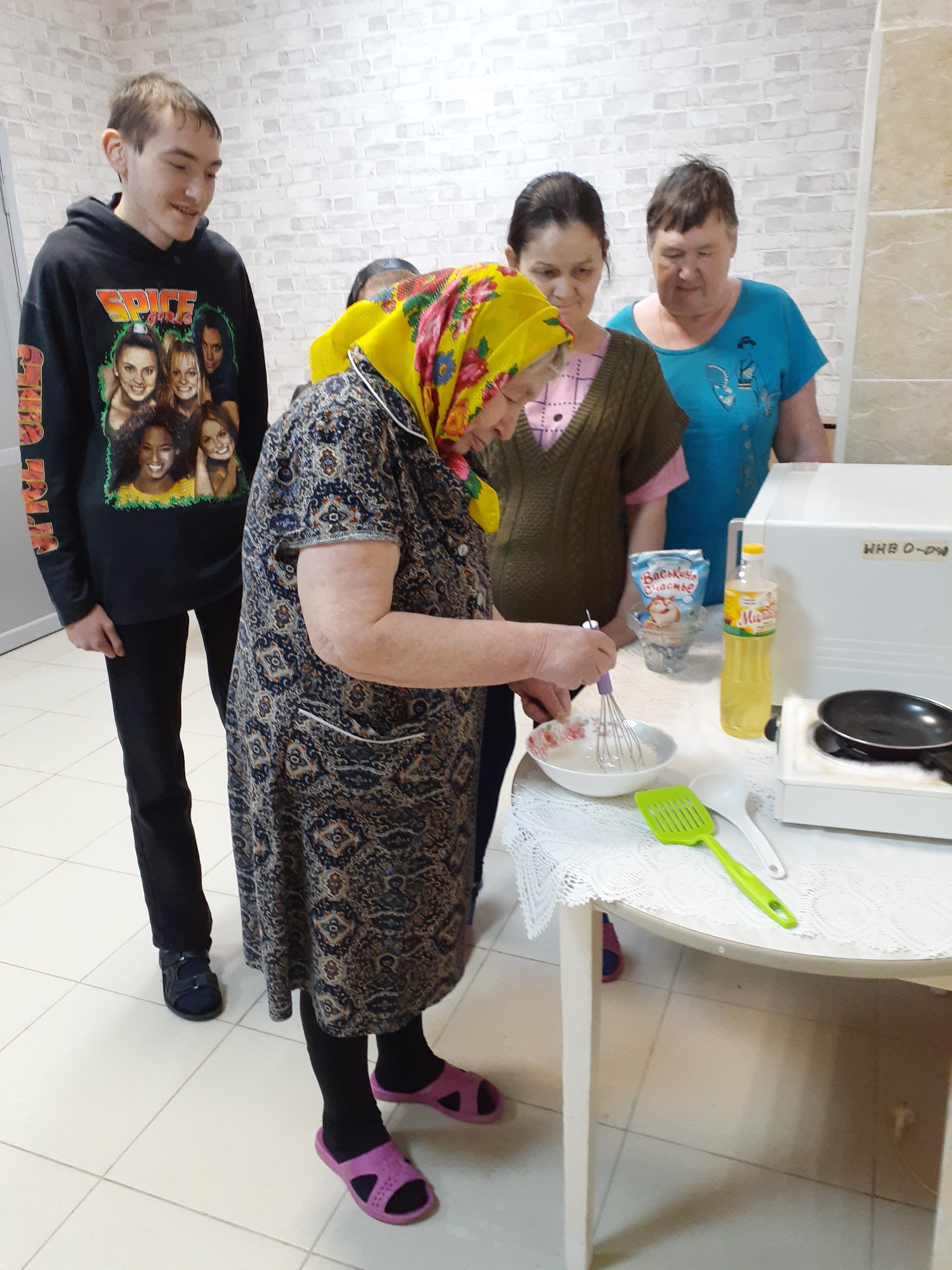 18 ноября в рамках национального проекта «Демография» для получателей социальных услуг с ментальными нарушениями, кулинарный мастер-класс по приготовлению блинчиков провела проживающая интерната Валентина Романовна Илюхина.