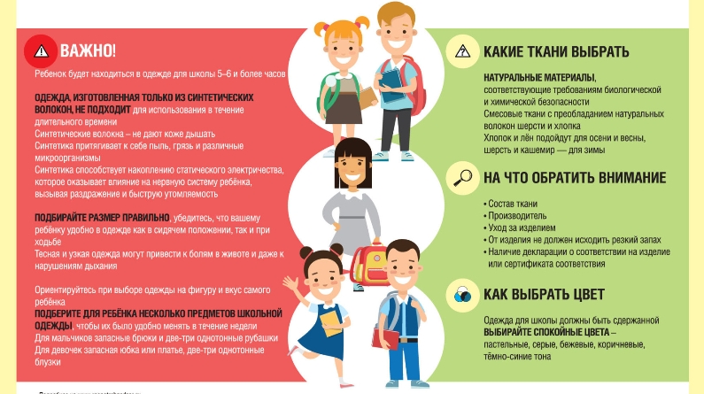 В преддверии нового учебного года Роспотребнадзор напоминает, что в первую очередь одежда для школы должна обеспечить сохранение детского здоровья. Родителям при приобретении школьной одежды для ребёнка важно помнить, что в ней он будет проводить 5–6 и более часов. В связи с этим, необходимо понимать, что одежда для школы, которая состоит только из синтетических волокон для этих целей не подойдет. Следует выбирать смесовые ткани с небольшим содержанием синтетических волокон.