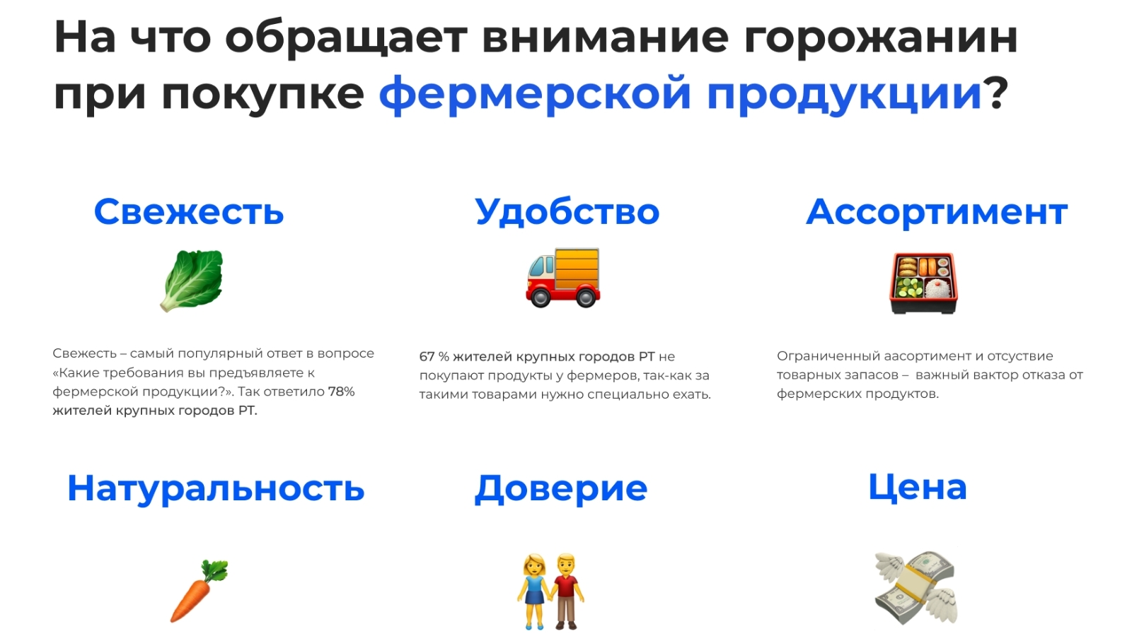 В целом более 80% опрошенных горожан из Татарстана заявили о своем положительном отношении к фермерской продукции, которую считают экологически чистой и более натуральной в отличие от той, что продается в магазинах (опрос также показал, в каких именно магазинах чаще закупаются горожане, пополняя свою продуктовую корзину).