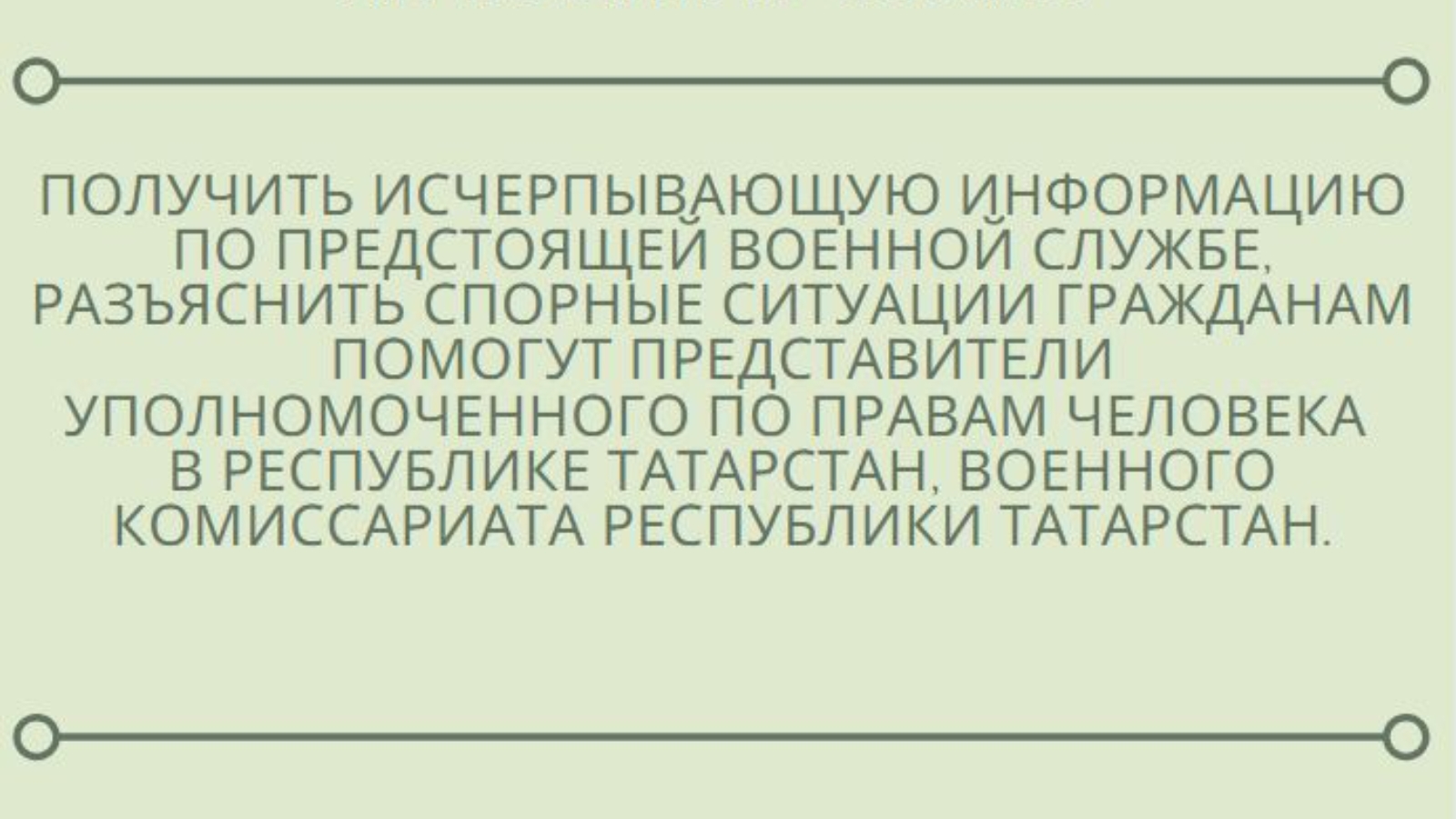 Основной целью прямого контакта с призывниками и их родственниками является предоставление достоверной информации. Получить исчерпывающую информацию по предстоящей военной службе, разъяснить спорные ситуации гражданам помогут представители Уполномоченного по правам человека в Республике Татарстан, Военного комиссариата Республики Татарстан.
