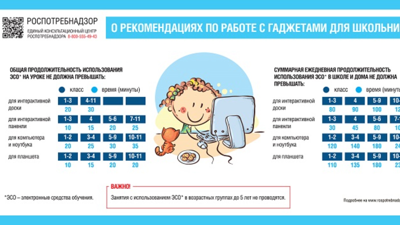 - для планшета - для 1-2 классов – 30 минут в школе и 80 минут дома, для 3-4 классов – 45 минут в школе и 90 минут дома, для 5-9 классов - 60 минут в школе и 120 минут дома, а для 10-11 классов – 80 минут в школе и 150 минут дома.