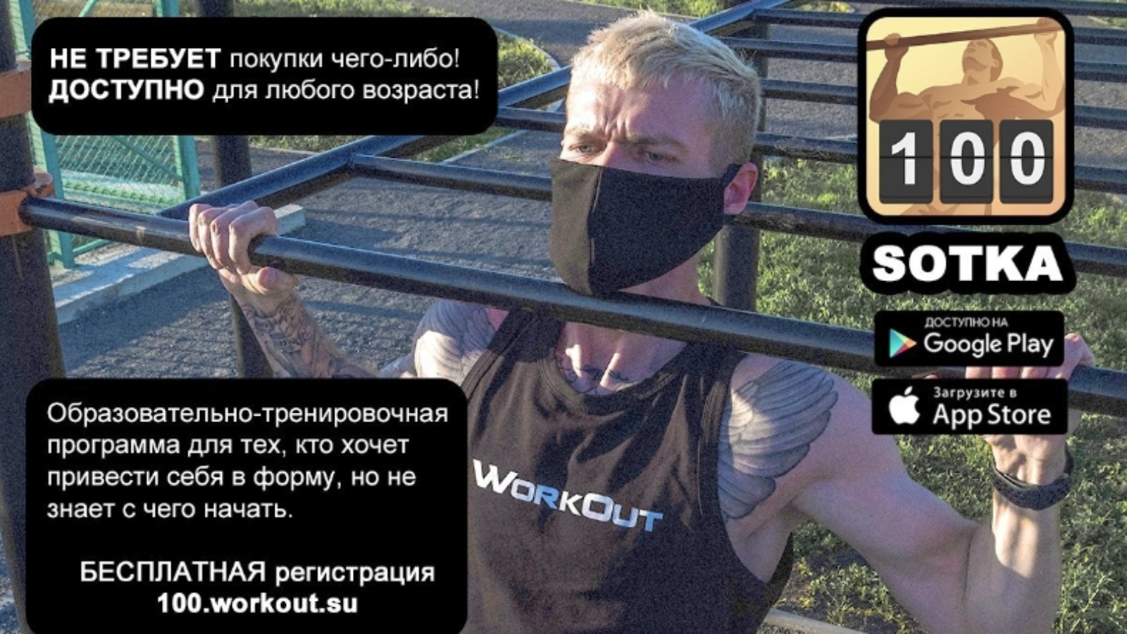 Прохождение программы индивидуально и начинается в момент установки мобильного приложения (workout.su/100iOS, workout.su/100Android) или записи на сайте проекта (workout.su/100IN).
