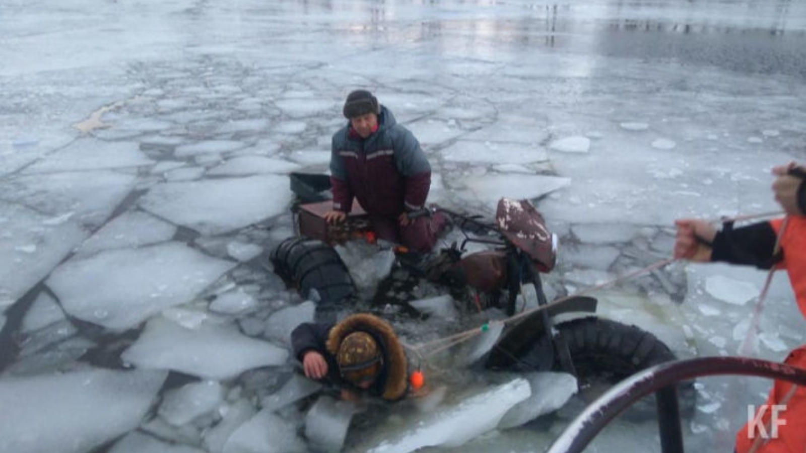 - Остановитесь в нескольких метрах от находящегося в воде человека и бросьте ему веревку, край одежды, подайте палку, лыжу или шест. Осторожно вытащите пострадавшего на лед и вместе с ним ползком выбирайтесь из опасной зоны.
