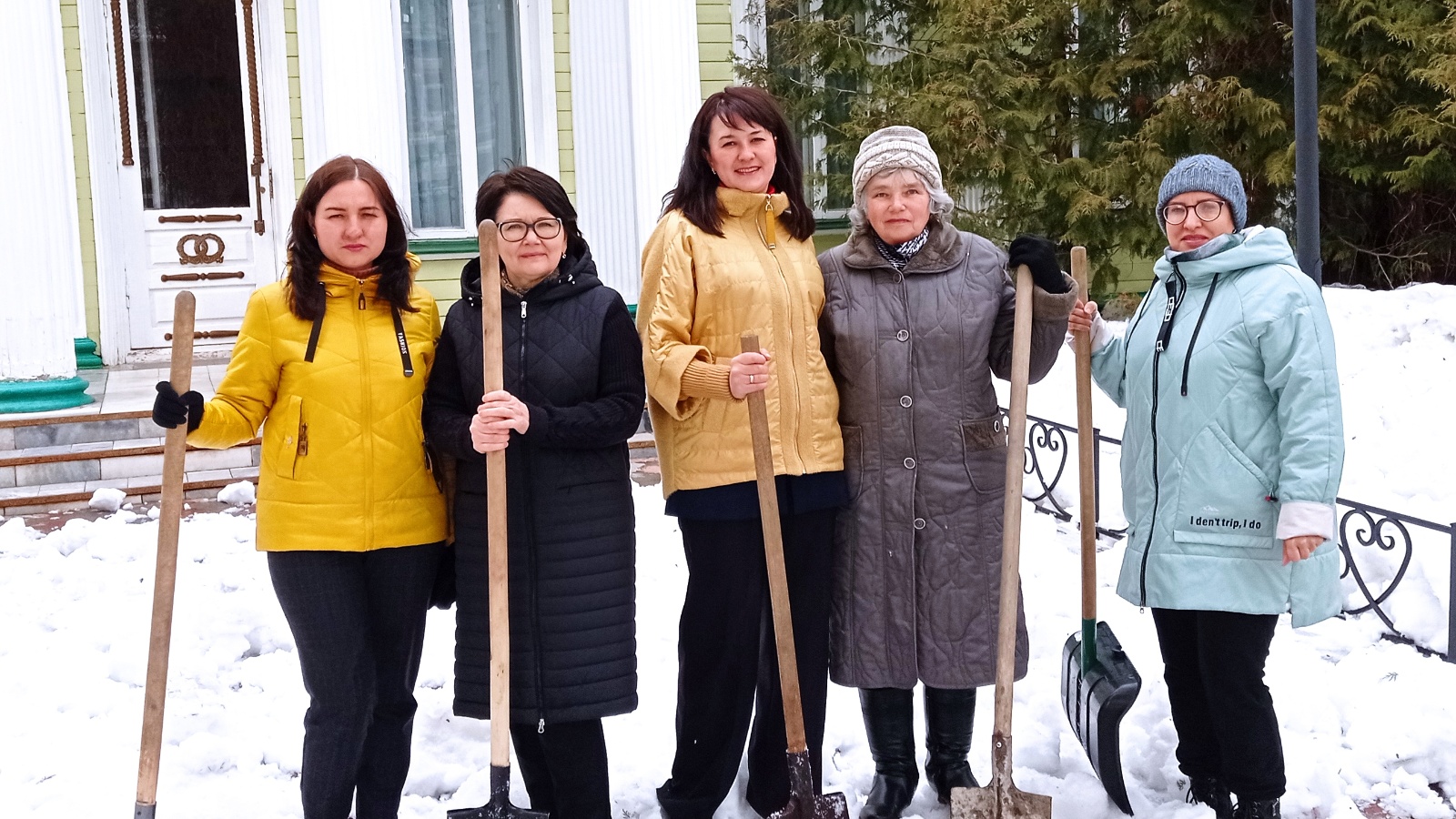 Сотрудники занимались очисткой территории, прилегающей к зданию Дворца бракосочетания от снежных сугробов.