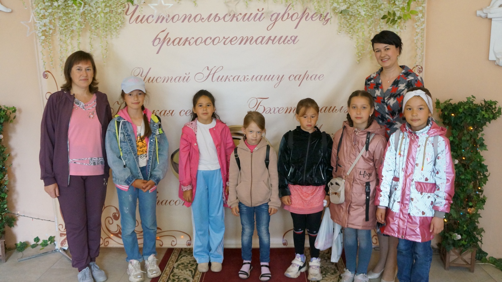 Маленьких гостей встретила начальник отдела ЗАГС Ильмира Ярмушева. Она познакомила детей с историей здания Дворца бракосочетаний, рассказала о том, что ЗАГС «проходит рядом с человеком от рождения и до самой смерти». Все данные на протяжении многих лет хранятся в архиве учреждения, где есть документы, которым около 100 лет. Дети с удовольствием осмотрели зал торжеств, комнаты жениха и невесты, оживленный интерес у ребят вызвал архив: полки, вид книг и их количество. Завершилась встреча памятными фотографиями.