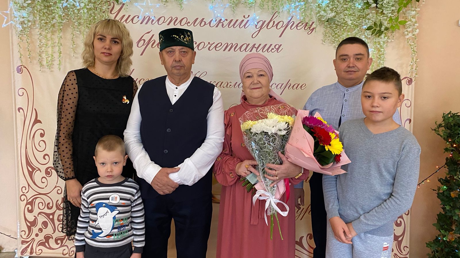 Поздравить юбиляров сегодня пришли близкие, родственники, друзья и почетные гости: начальник управления ЗАГС Кабинета Министров Республики Татарстан Гульшат Радифовна Нигматуллина, заместитель руководителя Исполнительного комитета Чистопольского муниципального района по социальным вопросам Галина Юрьевна Задворнова.