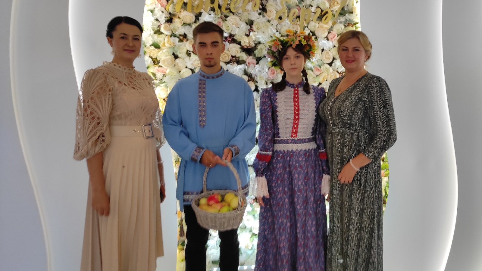 В Чистопольском Дворце бракосочетания молодоженов встречали нарядные участники Народного музыкально - драматического театра "Экспромт" в русских народных костюмах с корзиной наливных яблок. Яблоко символизирует начало новой семейной жизни и является символом верности и счастья.