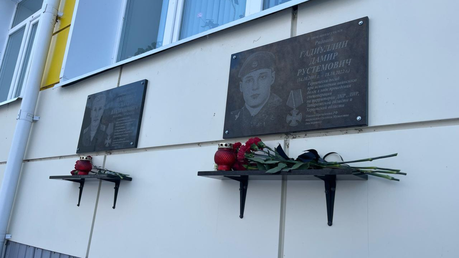 На стенах Александровской школы установили памятные таблички в честь бывших учеников Алексея Владимировича Плотникова и Дамира Рустемовича Гадиуллина, которые погибли в зоне Специальной военной операции.