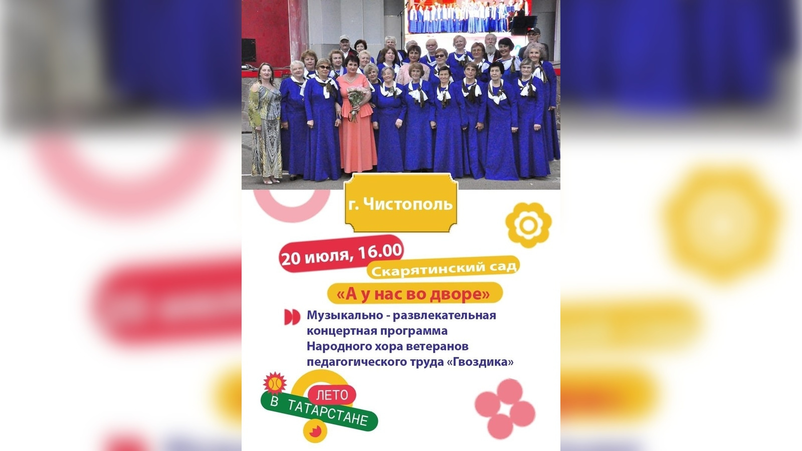 Уже 20 июля в 16:00 в Скарятинском саду состоится выступление народного хора ветеранов педагогического труда «Гвоздики».