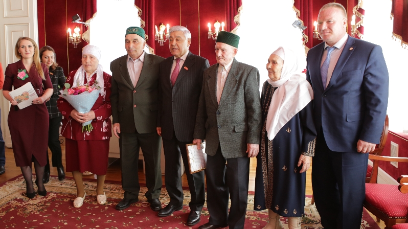 «Ныклы гаилә» проекты кысаларында ТАССРның 100 еллыгын бәйрәм итү алдыннан "бриллиант "юбилярлар Яруллиннарны һәм "алтын" юбилярлар Салаховларны котларга ТР Дәүләт Советы Рәисе Фәрит Мөхәммәтшин һәм Чистай муниципаль районы башлыгы Дмитрий Иванов килде.