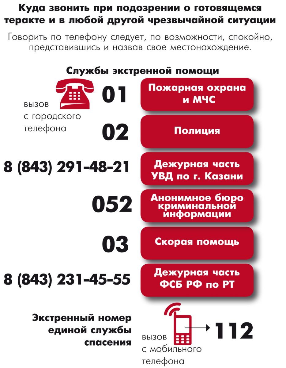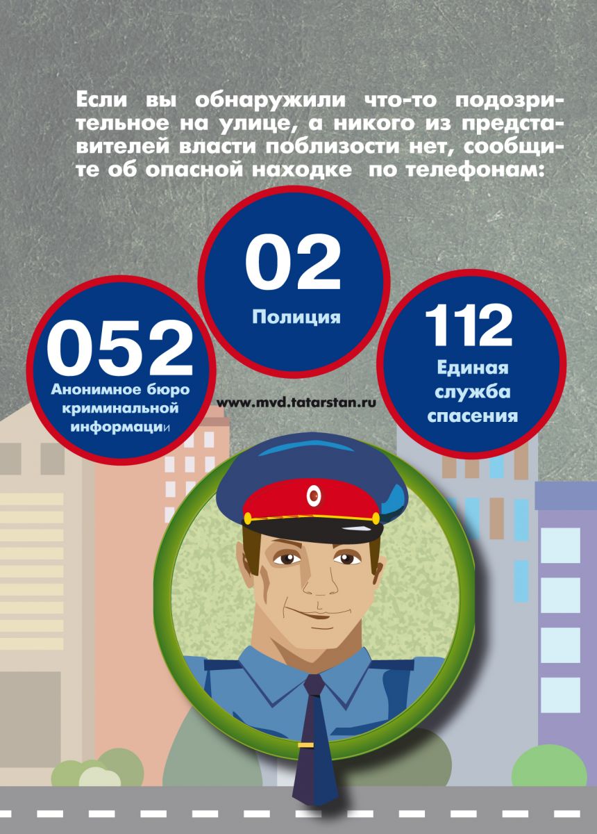 Әгәр сез урамда шикле нәрсә тапкансыз икән, ә якын-тирәдә хакимият вәкилләренең берсе дә юк, телефон аша куркыныч табылу турында хәбәр итегез: