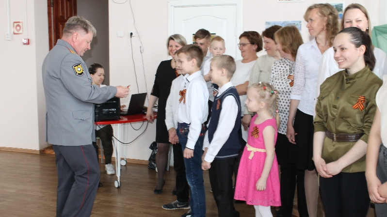 Ветераннар балаларга тәм-томнарны тапшырдылар, ә алар сугыш вакытында кунакларга үз куллары белән ясалган Георгий тасмаларын тапшырдылар.