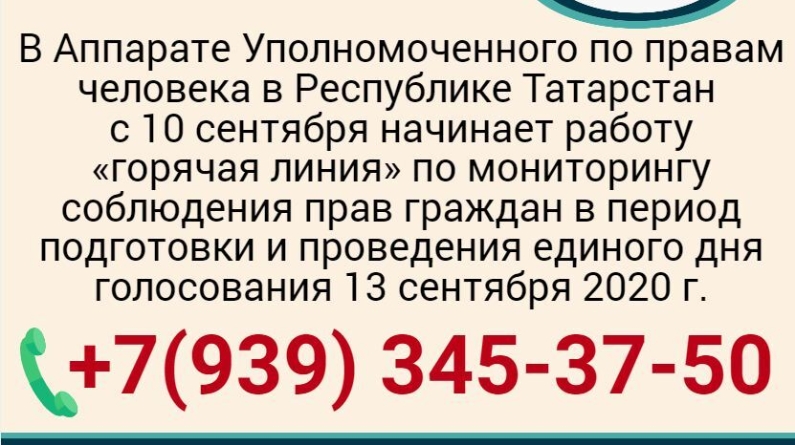 Татарстан Республикасында Кеше хокуклары буенча вәкаләтле вәкил Аппаратында 2020 елның 10 сентябреннән бердәм тавыш бирү көненә әзерлек һәм аны уздыру чорында гражданнарның хокукларын үтәүне мониторинглау буенча «кайнар линия» эшли башлый.