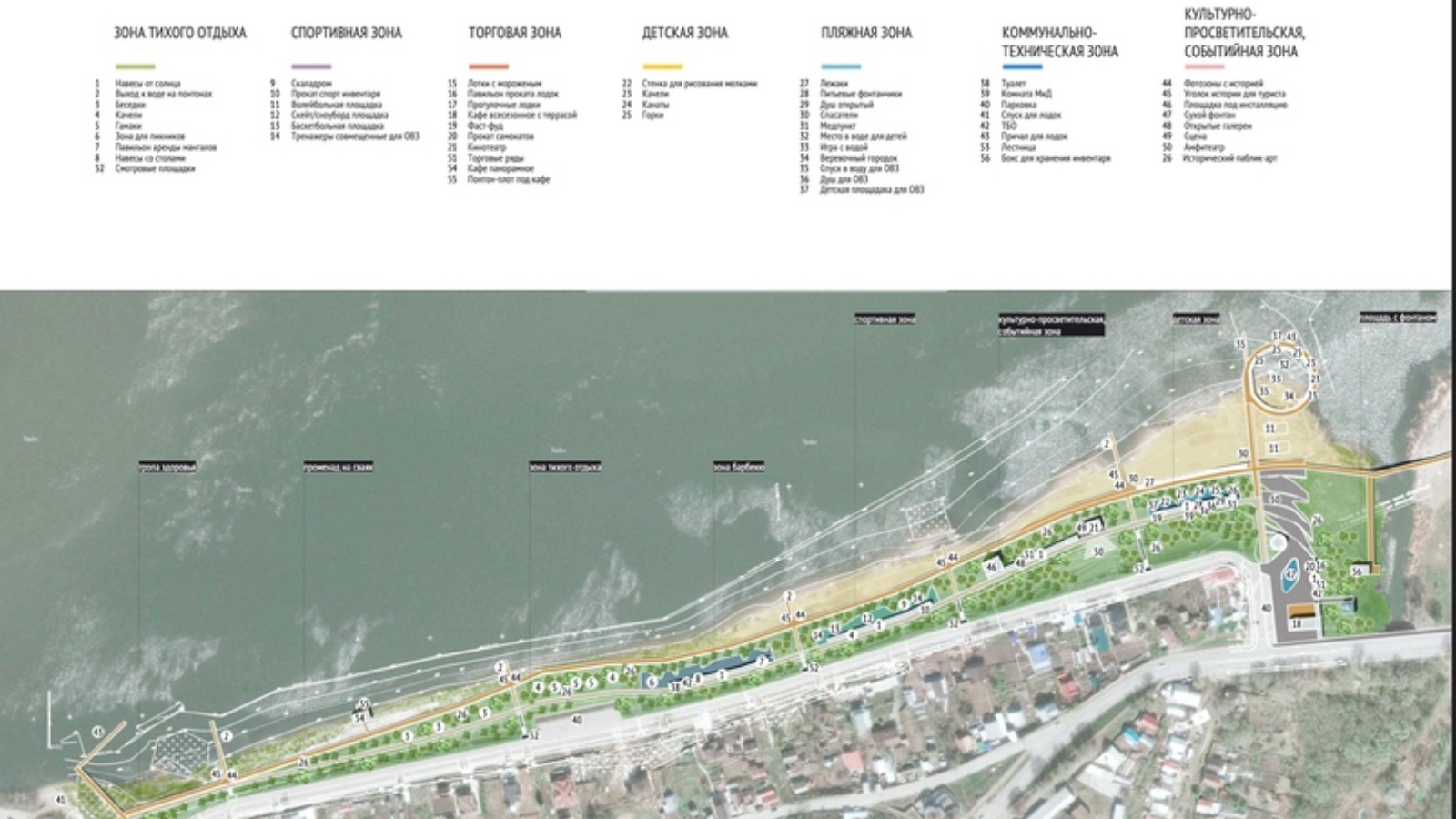 Яр буеның төп максаты-шәһәр халкының мәнфәгатьләрен һәм ихтыяҗларын исәпкә алу, шулай ук туристларны җәлеп итү һәм кызыксыну нокталары булдыру. Моның өчен без яр буйларын төрле функциональ зоналарга урнаштырдык, Сукмаклар һәм маршрутлар булдырдык, суга чыгу юлларын ачтык, көймәләр җибәрү өчен шартлар тудырдык.