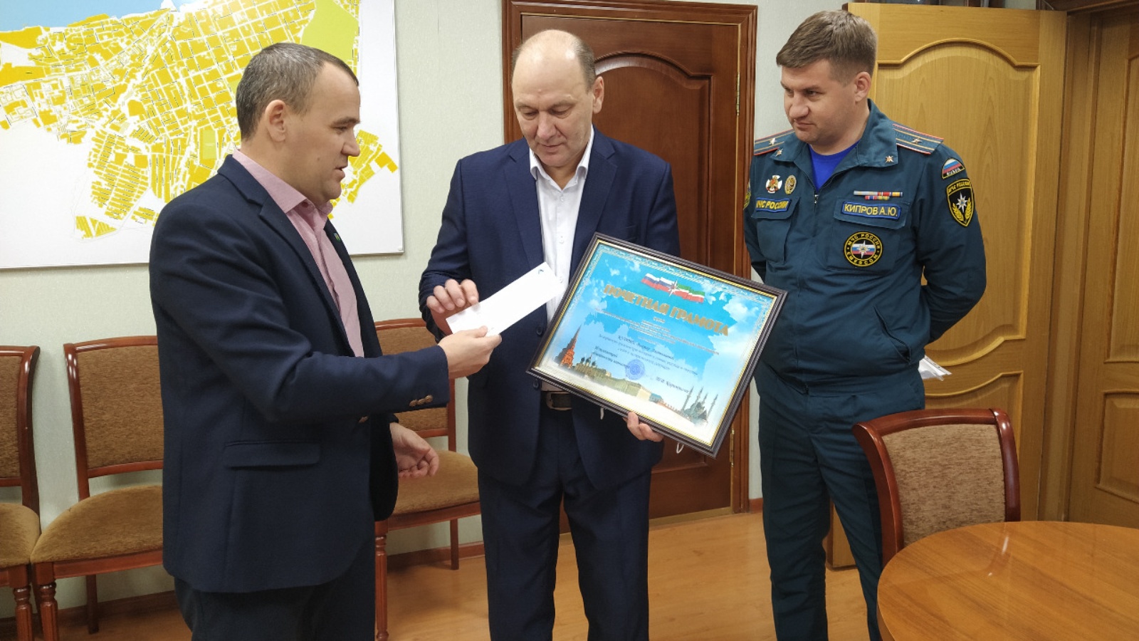Виктор Анатольевичка бүләкне Башкарма комитет җитәкчесе Эдуард Хәсәнов һәм 67 нче янгын-коткару бүлеге башлыгы Артем Кипров тапшырдылар.