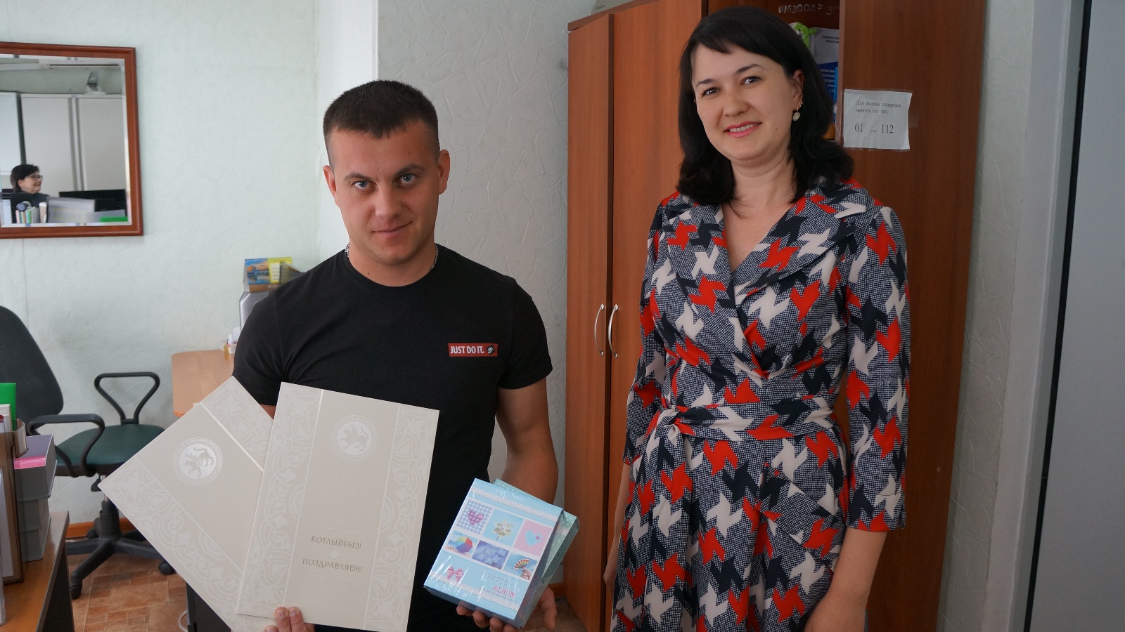 ГХАТ бүлеге җитәкчесе Ильмира Ярмушева бәхетле әтине тормышындагы мөһим вакыйга белән котлады, балалар туу турында беренче документларны, Татарстан Республикасы Президенты Рөстәм Миңнехановның котлау адресларын тапшырды һәм барысына да нык сәламәтлек, ата-аналарга балалар тәрбияләүдә сабырлык, Россия Федерациясенең яңа гражданнарына матур һәм хәерле тормышлар теләде.