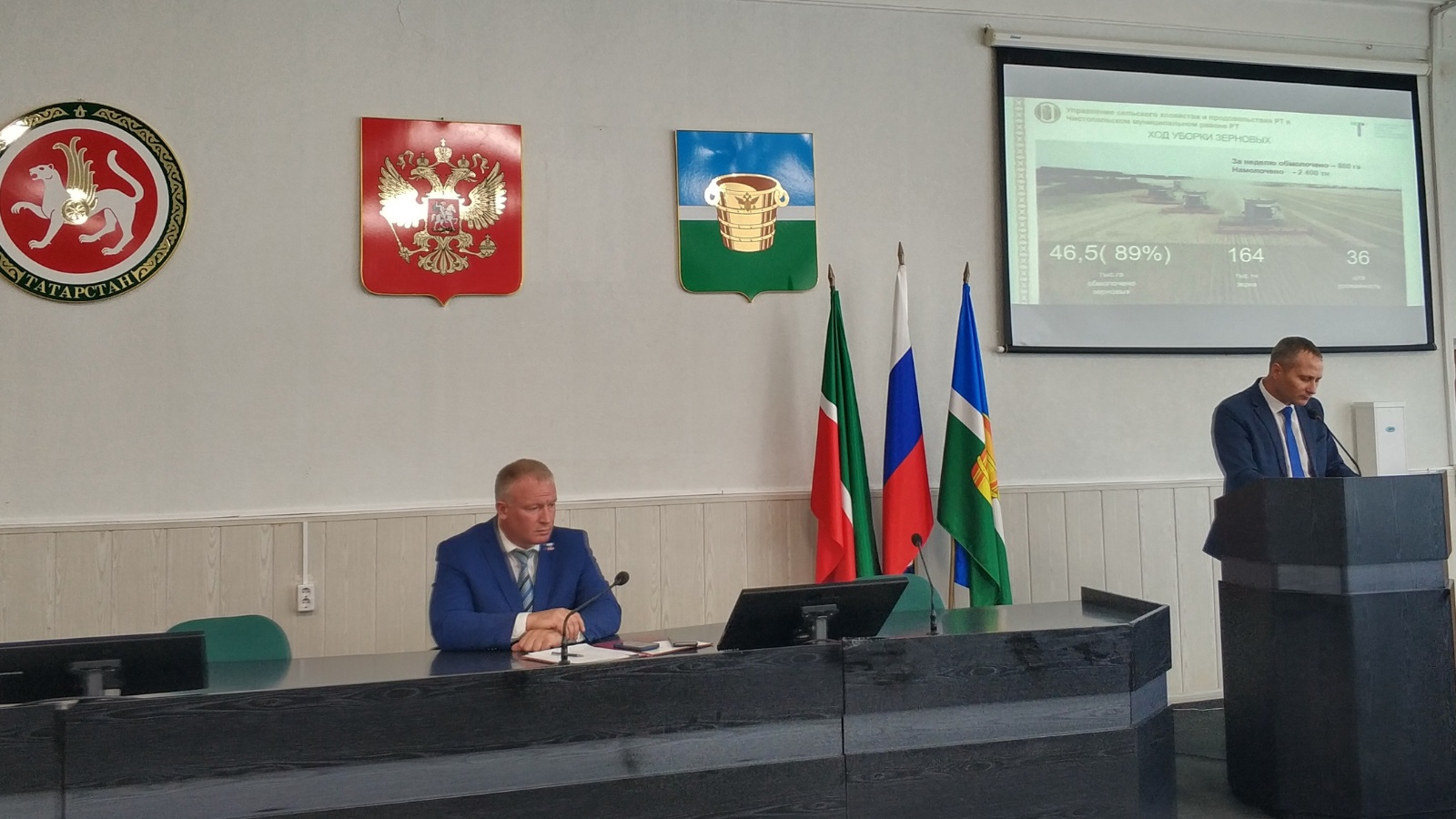 Агросәнәгать комплексындагы эшләрнең торышы турында авыл хуҗалыгы һәм азык-төлек идарәсе башлыгы Александр Ромадановский сөйләде. Узган атнада яуган явым-төшем урып-җыюны бераз катлауландырды, әмма ул дәвам итә. Әле 900 гектар язгы бодай, 700 гектар карабодай, 5 мең гектардан артык бөртеккә кукуруз, 15,5 мең гектардан артык техник культуралар җыеп аласы бар. Шулай ук бәрәңге җыю дәвам итә.