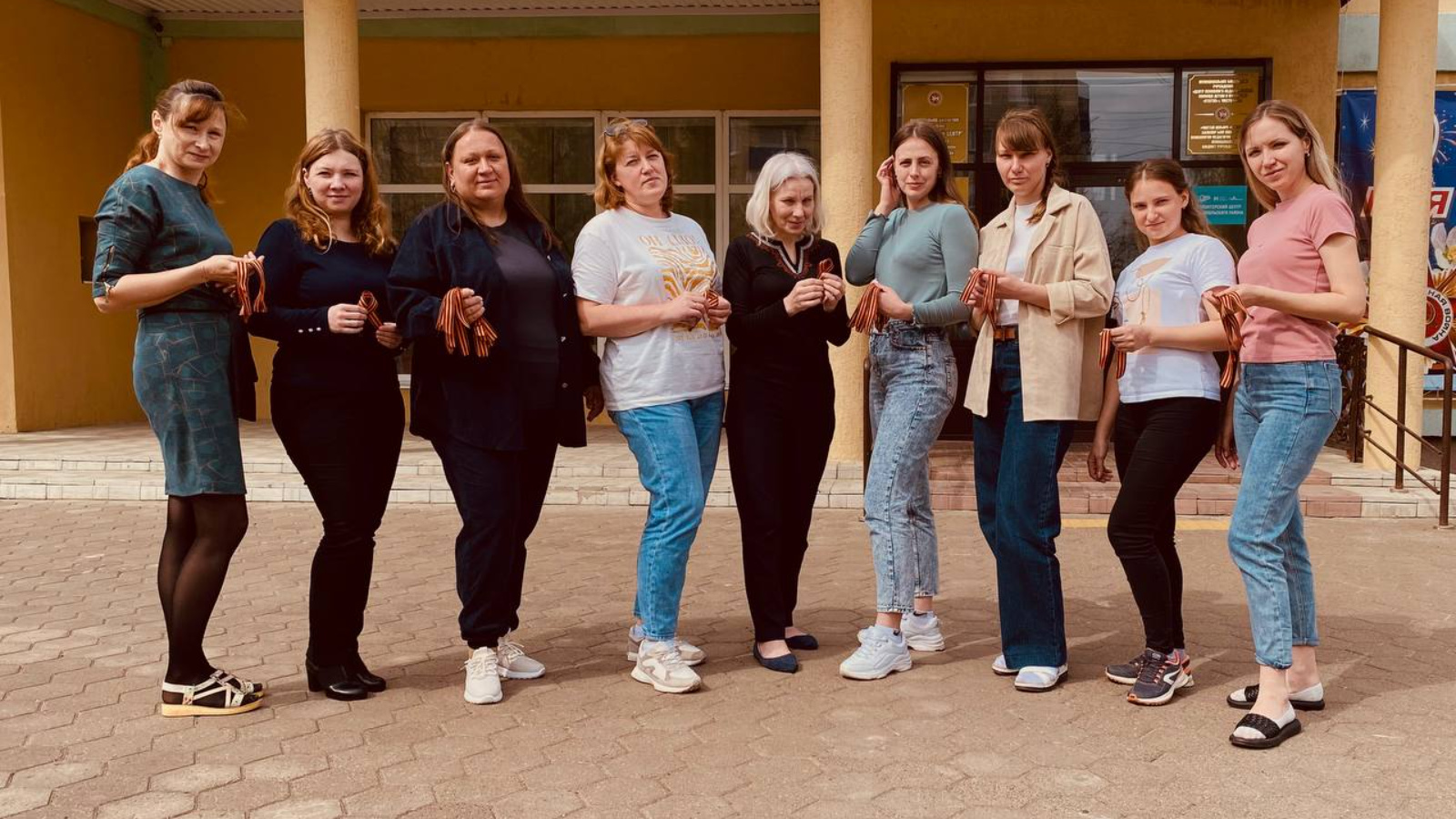 "Молодежный центр" МБУ хезмәткәрләре "Мельничная площадь" микрорайонында яшәүчеләргә Җиңү символы - Георгий тасмасын тапшыру өчен урамга чыктылар һәм 9 Май бәйрәме белән котладылар.