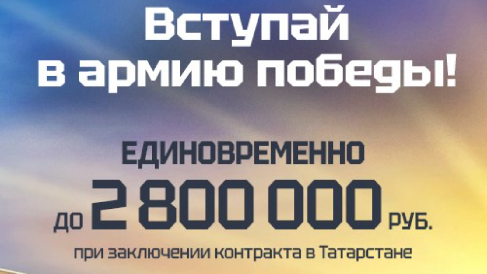 Җиңү Армиясенә кер! Хәрби хезмәткә контрактка кул куй һәм 2 800 000 сумга кадәр бер тапкыр бирелә торган түләү ал. Рәсмиләштерү бераз вакыт алачак, медкомиссия уртача 1,5 сәгать тирәсе, барысы да бер урында.