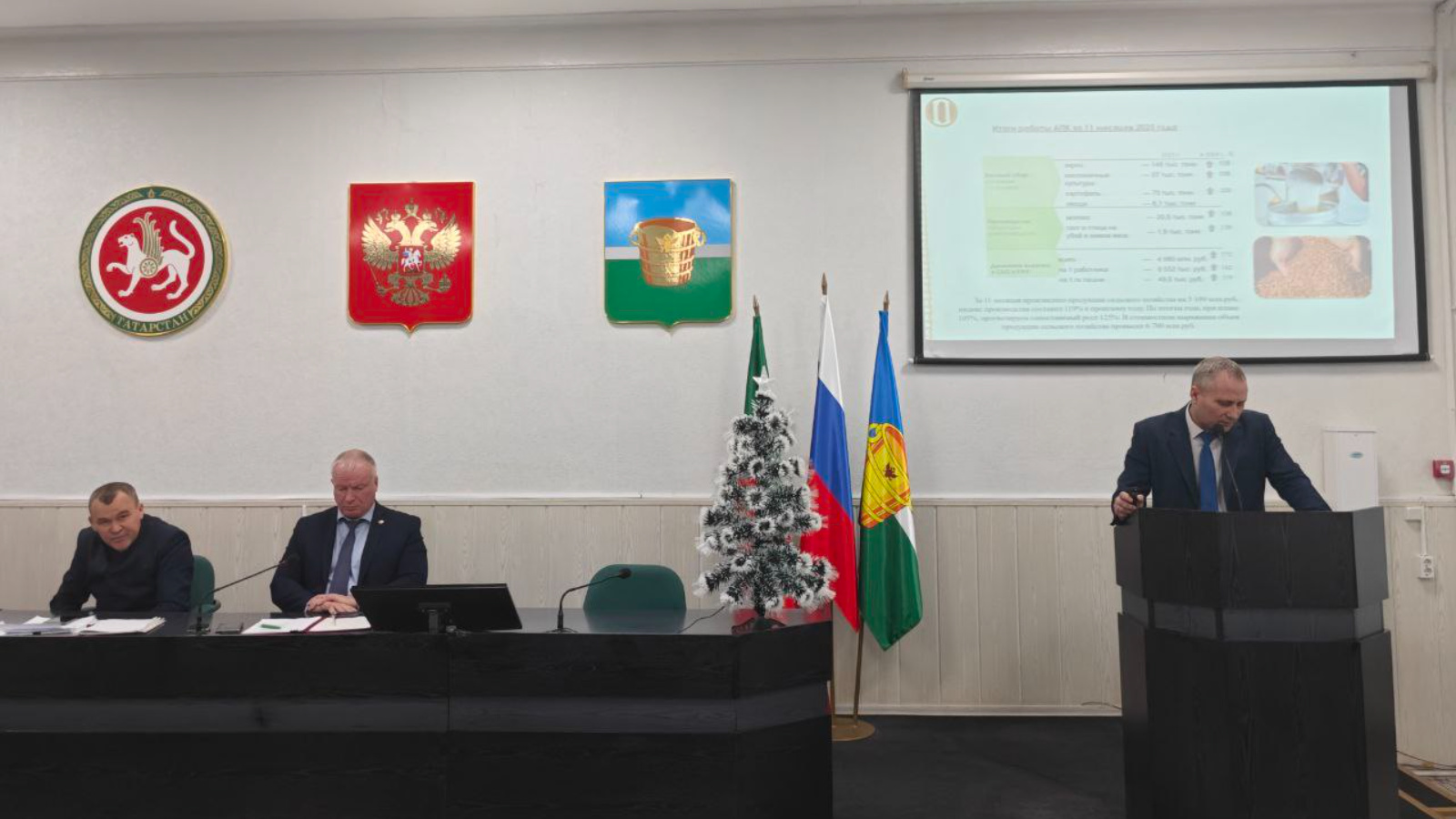 Агросәнәгать комплексының 11 айлык эш йомгаклары турында авыл хуҗалыгы һәм азык-төлек идарәсе башлыгы Александр Ромадановский сөйләде. Хисап чорында җитештерелгән авыл хуҗалыгы продукциясе күләме 5,1 млрд сумга җитте. Җитештерү индексы узган елның шушы чорына карата 119% тәшкил итте, барлык тармакларда да үсеш күзәтелә. Үсемлекчелектә, бигрәк тә бәрәңге җитештерүдә шактый үсеш күзәтелә. Ит җитештерү буенча үсеш узган елга караганда 39 процент тәшкил иткән, сөт җитештерү буенча – 8 процент. Районның авыл хуҗалыгы оешмаларында хезмәт җитештерүчәнлеге бермә-бер артты.